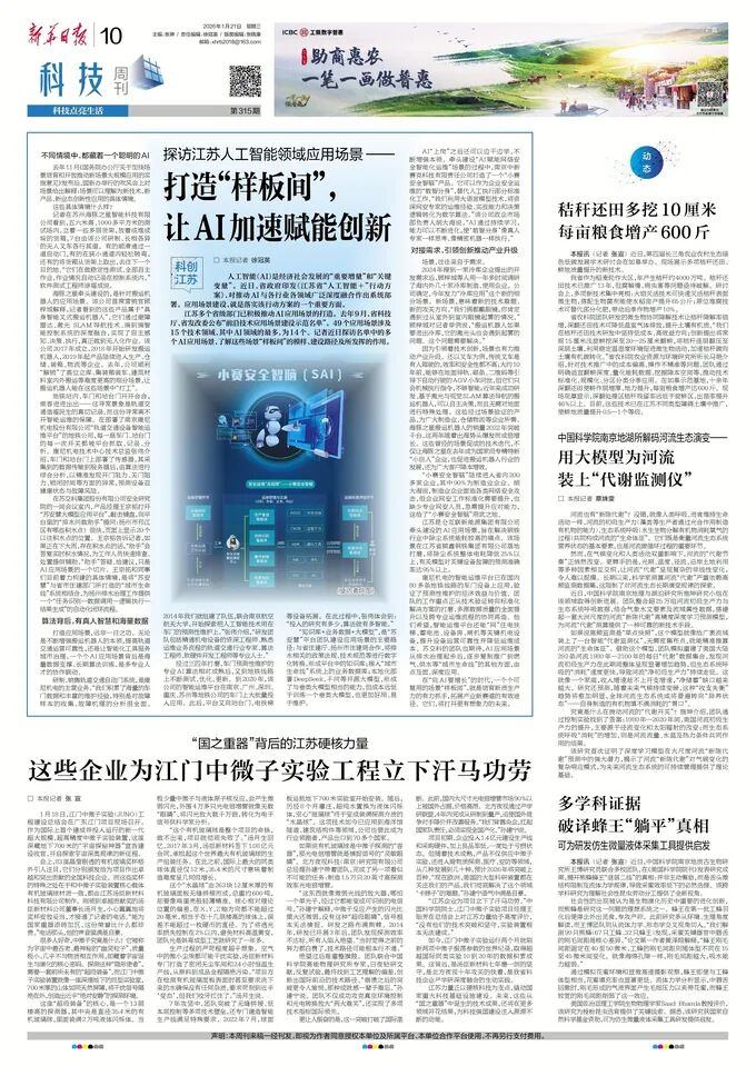2026年1月21日,《新华日报》以《探访江苏人工智能领域应用场景——打造“样板间”, 让AI加速赋能创新》为题,报道了华体会体育等入选江苏省“前沿技术应用场景建设示范名单”企业,在应用场景建设方面的实践与成效。
